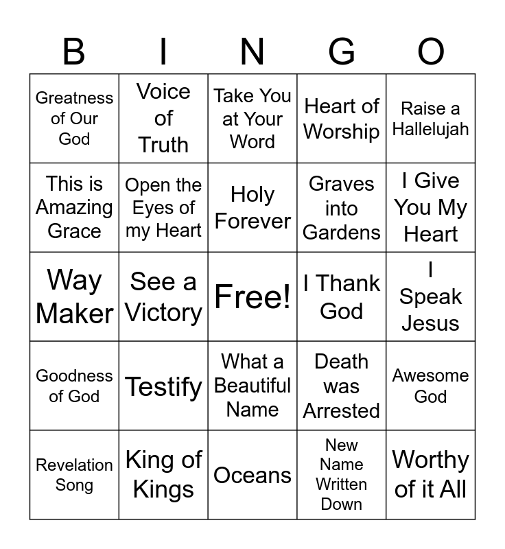 This bingo card has a free space and 24 words: Testify, King of Kings, Holy Forever, Revelation Song, Raise a Hallelujah, Greatness of Our God, This is Amazing Grace, Voice of Truth, I Thank God, What a Beautiful Name, Graves into Gardens, Way Maker, Death was Arrested, Awesome God, Open the Eyes of my Heart, New Name Written Down, I Speak Jesus, Take You at Your Word, I Give You My Heart, See a Victory, Worthy of it All, Goodness of God, Heart of Worship and Oceans.