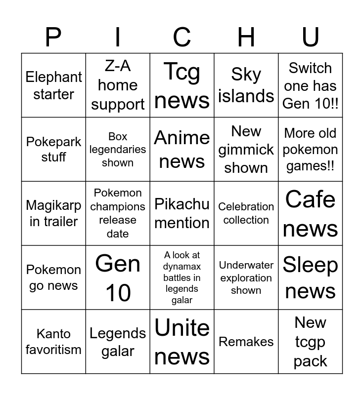 This bingo card has a free space and 24 words: Gen 10, Legends galar, Anime news, Kanto favoritism, Switch one has Gen 10!!, Elephant starter, Pokepark stuff, Z-A home support, Celebration collection, A look at dynamax battles in legends galar, New gimmick shown, Magikarp in trailer, Underwater exploration shown, Sleep news, Box legendaries shown, Remakes, Cafe news, Tcg news, More old pokemon games!!, Pokemon champions release date, New tcgp pack, Pokemon go news, Sky islands and Unite news.