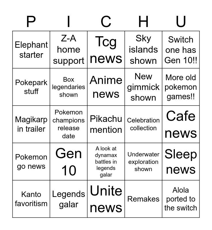 This bingo card has a free space and 24 words: Gen 10, Legends galar, Anime news, Kanto favoritism, Switch one has Gen 10!!, Elephant starter, Pokepark stuff, Z-A home support, Celebration collection, A look at dynamax battles in legends galar, New gimmick shown, Magikarp in trailer, Underwater exploration shown, Sleep news, Box legendaries shown, Remakes, Cafe news, Tcg news, More old pokemon games!!, Pokemon champions release date, Alola ported to the switch, Pokemon go news, Sky islands shown and Unite news.