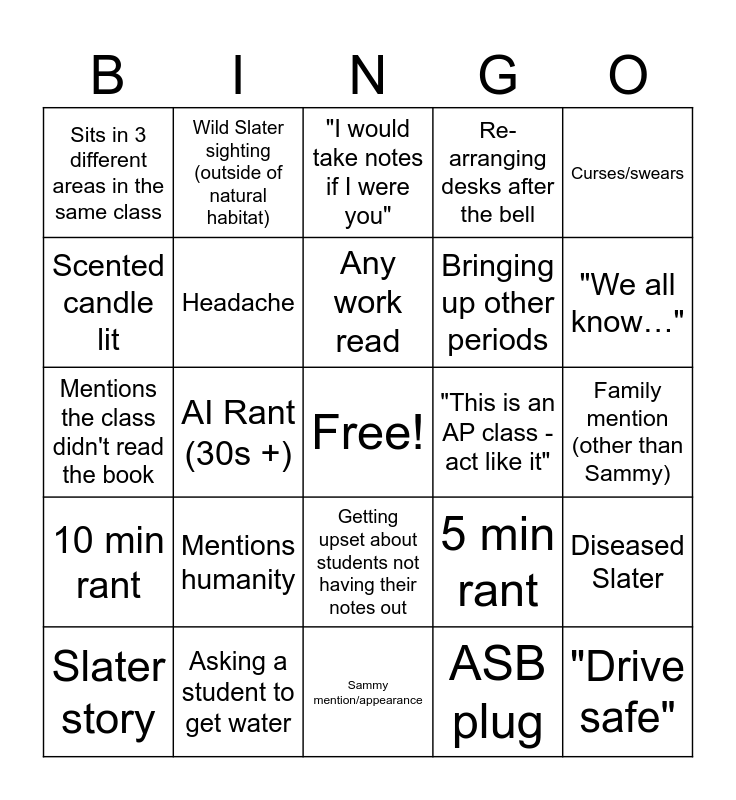 This bingo card has a free space and 30 words: Asking a student to get water, Asking a student to stop cutting her off, AI Rant (30s +), Distracted while talking, Sits in 3 different areas in the same class, "I would take notes if I were you", Headache, Getting upset about students not having their notes out, "This is an AP class - act like it", Sammy mention/appearance, Family mention (other than Sammy), "Drive safe", ASB plug, All eyes on me (x2), "We all know…", 2 min rant, 5 min rant, 10 min rant, Mentions humanity, Curses/swears, Mentions the class didn't read the book, Someone asks about an upcoming quiz/chapters to read, Wild Slater sighting (outside of natural habitat), Bringing up other periods, Scented candle lit, Re-arranging desks after the bell, Diseased Slater, Slater story, Any work read and Questions so far.
