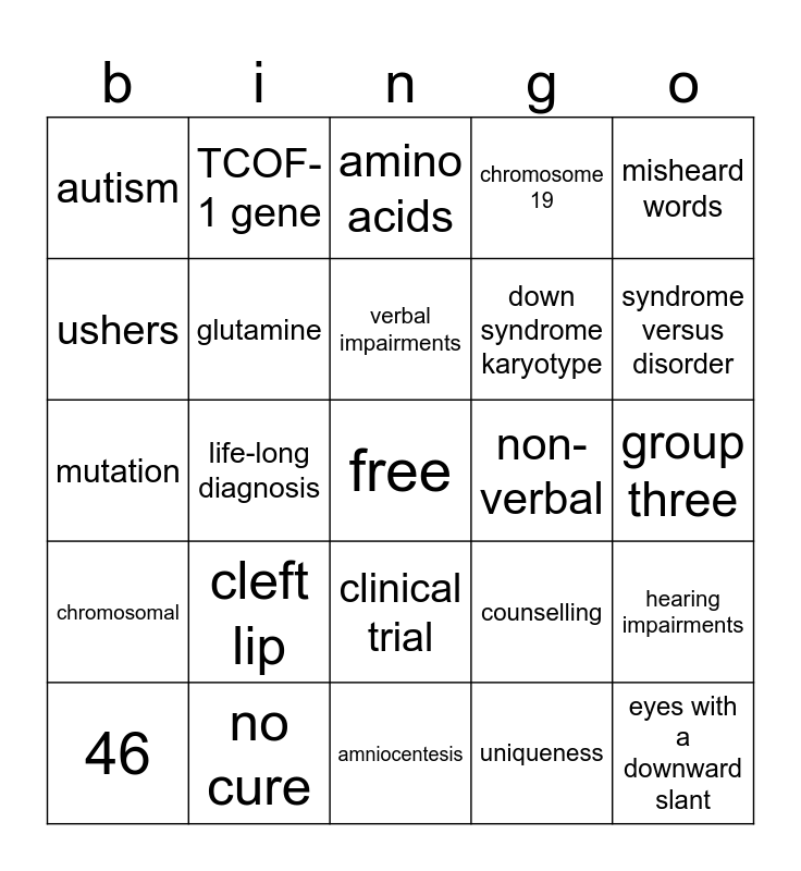 This bingo card has a free space and 29 words: 46, mucus filled cough, life-long diagnosis, communicative impairments, autism, amino acids, glutamine, cleft lip, non-verbal, no cure, group three, eyes with a downward slant, amniocentesis, uniqueness, syndrome versus disorder, fragile X syndrome, clinical trial, chromosomal, misheard words, mutation, counselling, early intervention, down syndrome karyotype, ushers, chromosome 19, TCOF-1 gene, hearing impairments, verbal impairments and communication.