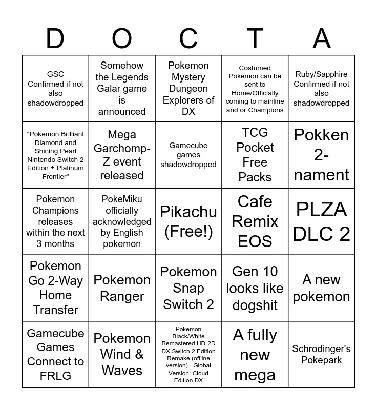 This bingo card has a free space and 24 words: Pokemon Ranger, Pokemon Wind & Waves, Gamecube games shadowdropped, Gamecube Games Connect to FRLG, Ruby/Sapphire Confirmed if not also shadowdropped, GSC Confirmed if not also shadowdropped, "Pokemon Brilliant Diamond and Shining Pearl Nintendo Switch 2 Edition + Platinum Frontier", Somehow the Legends Galar game is announced, Cafe Remix EOS, Pokemon Snap Switch 2, TCG Pocket Free Packs, Pokemon Champions releases within the next 3 months, Gen 10 looks like dogshit, A new pokemon, Mega Garchomp-Z event released, A fully new mega, PLZA DLC 2, Pokemon Mystery Dungeon Explorers of DX, Pokken 2-nament, PokeMiku officially acknowledged by English pokemon, Schrodinger's Pokepark, Pokemon Go 2-Way Home Transfer, Costumed Pokemon can be sent to Home/Officially coming to mainline and or Champions and Pokemon Black/White Remastered HD-2D DX Switch 2 Edition Remake (offline version) - Global Version: Cloud Edition DX.
