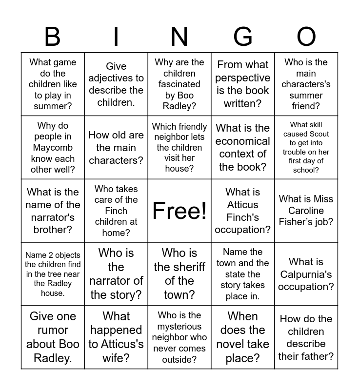 This bingo card has a free space and 24 words: Who is the narrator of the story?, What happened to Atticus's wife?, Which friendly neighbor lets the children visit her house?, Give one rumor about Boo Radley., Who is the main characters's summer friend?, What game do the children like to play in summer?, Why do people in Maycomb know each other well?, Give adjectives to describe the children., What is Atticus Finch's occupation?, Who is the sheriff of the town?, What is the economical context of the book?, What is the name of the narrator's brother?, Name the town and the state the story takes place in., What is Calpurnia's occupation?, How old are the main characters?, When does the novel take place?, What is Miss Caroline Fisher’s job?, Why are the children fascinated by Boo Radley?, What skill caused Scout to get into trouble on her first day of school?, Who takes care of the Finch children at home?, How do the children describe their father?, Name 2 objects the children find in the tree near the Radley house., From what perspective is the book written? and Who is the mysterious neighbor who never comes outside?.
