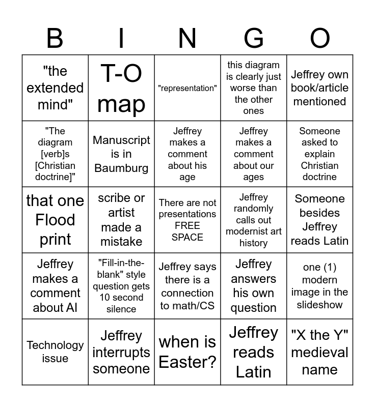 This bingo card has a free space and 24 words: "Fill-in-the-blank" style question gets 10 second silence, Jeffrey interrupts someone, Jeffrey makes a comment about his age, Technology issue, Jeffrey own book/article mentioned, "the extended mind", "The diagram [verb]s [Christian doctrine]", T-O map, Jeffrey randomly calls out modernist art history, Jeffrey says there is a connection to math/CS, Jeffrey makes a comment about our ages, that one Flood print, Jeffrey answers his own question, one (1) modern image in the slideshow, Manuscript is in Baumburg, Jeffrey reads Latin, Someone besides Jeffrey reads Latin, "representation", Someone asked to explain Christian doctrine, scribe or artist made a mistake, "X the Y" medieval name, Jeffrey makes a comment about AI, this diagram is clearly just worse than the other ones and when is Easter?.