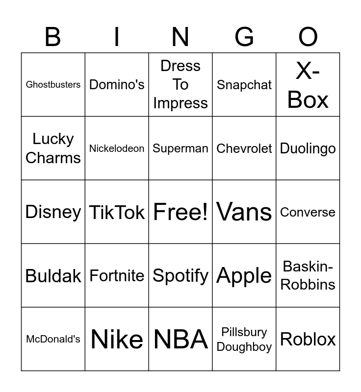 This bingo card has a free space and 40 words: Batman, Disney, PlayStation, Nickelodeon, Nike, Spotify, Superman, Starbucks, X-Box, Buldak, TikTok, Snapchat, Roblox, Converse, Vans, Fortnite, Harry Potter, Ghostbusters, Cinnamoroll, Dress To Impress, Baskin-Robbins, Pillsbury Doughboy, Chevrolet, Lucky Charms, Taco Bell, CBS, Target, Ulta, Sephora, Pizza Hut, DreamWorks, McDonald's, Wendy's, Apple, Duolingo, NBA, Olympics, Instagram, Domino's and Microsoft.