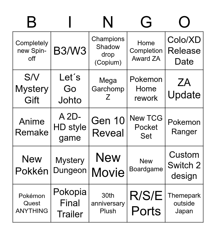 This bingo card has a free space and 24 words: Mystery Dungeon, Pokopia Final Trailer, Mega Garchomp Z, Pokémon Quest ANYTHING, Colo/XD Release Date, Completely new Spin-off, S/V Mystery Gift, B3/W3, New TCG Pocket Set, New Movie, Pokemon Home rework, Anime Remake, New Boardgame, Custom Switch 2 design, Let´s Go Johto, R/S/E Ports, Pokemon Ranger, Champions Shadow drop (Copium), ZA Update, A 2D-HD style game, Themepark outside Japan, New Pokkén, Home Completion Award ZA and 30th anniversary Plush.
