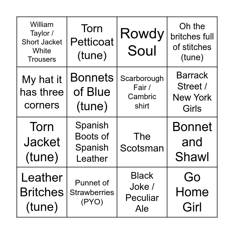 This bingo card has 16 words: Leather Britches (tune), Punnet of Strawberries (PYO), Rowdy Soul, Oh the britches full of stitches (tune), My hat it has three corners, Torn Petticoat (tune), The Scotsman, Bonnet and Shawl, William Taylor / Short Jacket White Trousers, Bonnets of Blue (tune), Black Joke / Peculiar Ale, Barrack Street / New York Girls, Torn Jacket (tune), Spanish Boots of Spanish Leather, Scarborough Fair / Cambric shirt and Go Home Girl.