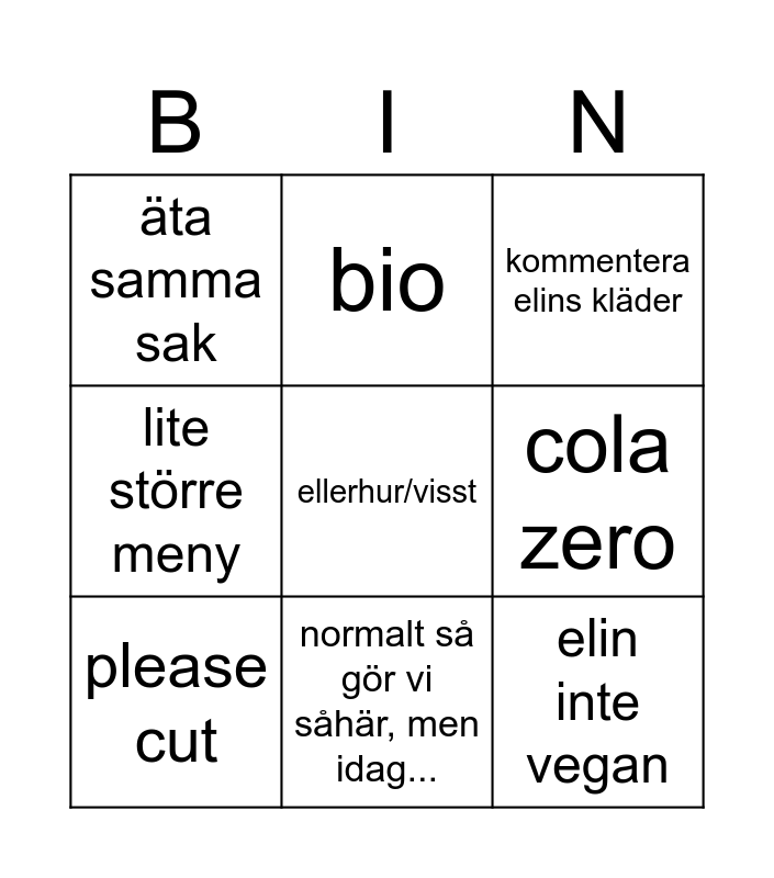 This bingo card has a free space and 8 words: cola zero, kommentera elins kläder, bio, please cut, äta samma sak, elin inte vegan, lite större meny and normalt så gör vi såhär, men idag....