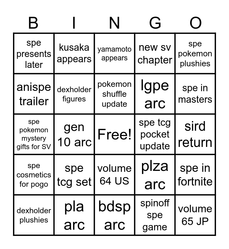 This bingo card has a free space and 24 words: spe tcg set, pla arc, pokemon shuffle update, dexholder plushies, spe pokemon plushies, spe presents later, anispe trailer, kusaka appears, spe tcg pocket update, volume 64 US, lgpe arc, spe pokemon mystery gifts for SV, plza arc, spe in fortnite, dexholder figures, spinoff spe game, sird return, yamamoto appears, spe in masters, gen 10 arc, volume 65 JP, spe cosmetics for pogo, new sv chapter and bdsp arc.