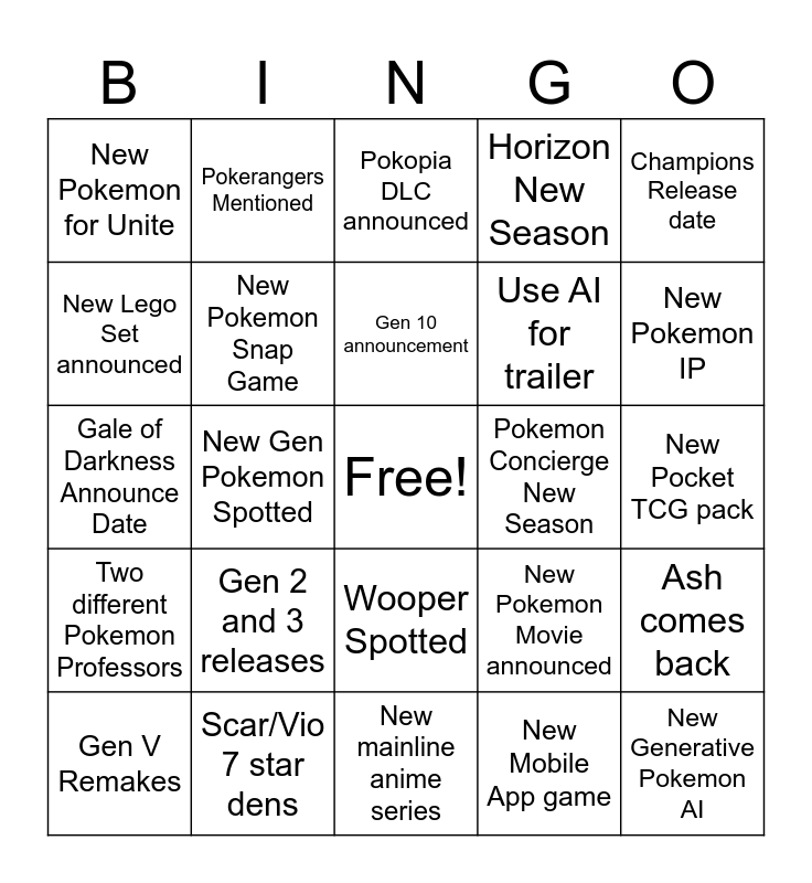This bingo card has a free space and 24 words: Gen V Remakes, Gen 2 and 3 releases, Gen 10 announcement, New Mobile App game, Champions Release date, New Pokemon for Unite, Pokerangers Mentioned, Pokopia DLC announced, Pokemon Concierge New Season, New Pocket TCG pack, Gale of Darkness Announce Date, New Pokemon Snap Game, New Pokemon Movie announced, Ash comes back, New Lego Set announced, Scar/Vio 7 star dens, New mainline anime series, Horizon New Season, New Pokemon IP, Two different Pokemon Professors, New Gen Pokemon Spotted, Wooper Spotted, Use AI for trailer and New Generative Pokemon AI.