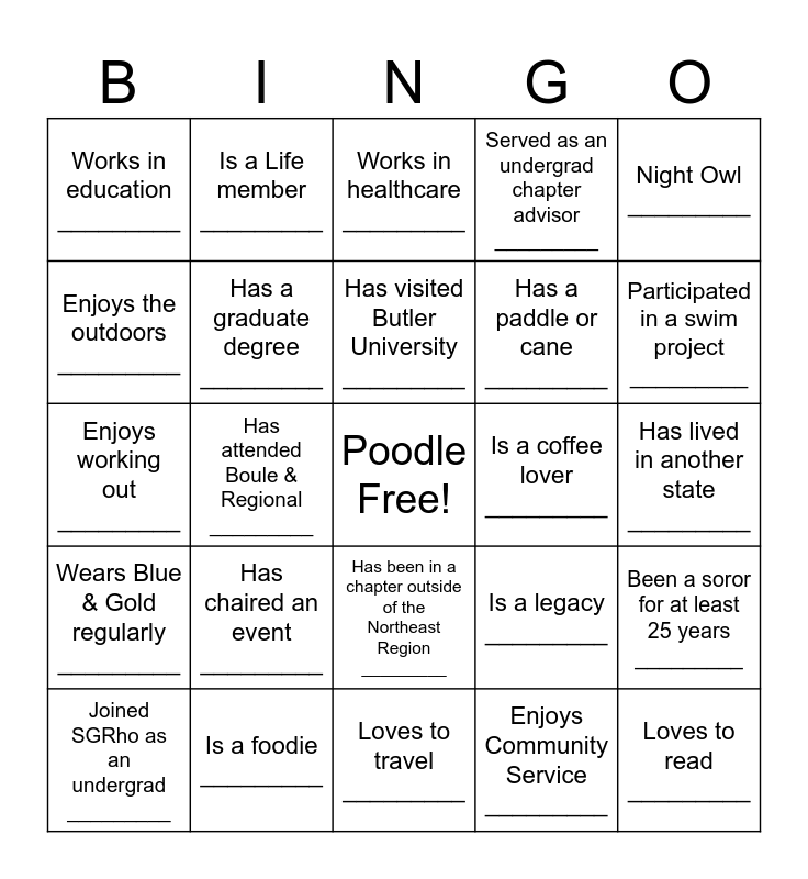 This bingo card has a free space and 29 words: Joined SGRho as an undergrad _________, Knows the founders' names _________, Has attended Boule & Regional _________, Has served on a committee _________, Works in education _________, Works in healthcare _________, Has a graduate degree _________, Has chaired an event _________, Is a coffee lover _________, Is a foodie _________, Has lived in another state _________, Loves to read _________, Loves to travel _________, Enjoys Community Service _________, Participated in a swim project _________, Enjoys Mentoring _________, Has been in a chapter outside of the Northeast Region _________, Wears Blue & Gold regularly _________, Night Owl _________, Enjoys working out _________, Is a legacy _________, Served on the Exec Board _________, Has a paddle or cane _________, Enjoys the outdoors _________, Served as an undergrad chapter advisor _________, Is a Life member _________, Been a soror for at least 25 years _________, Has visited Butler University _________ and Plays a musical instrument _________.