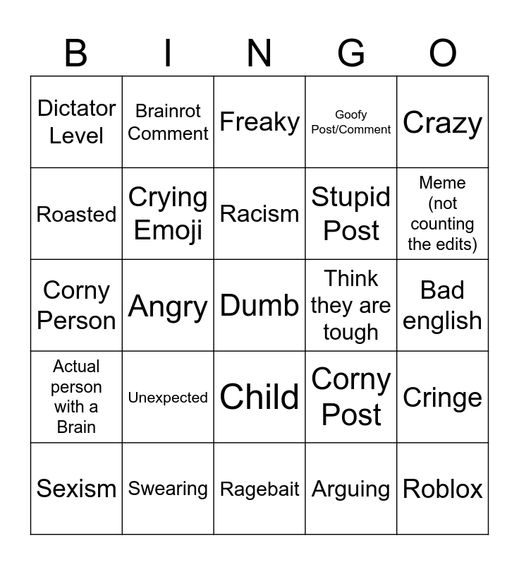 This bingo card has a free space and 24 words: Unexpected, Swearing, Racism, Sexism, Crazy, Dictator Level, Roasted, Brainrot Comment, Think they are tough, Child, Stupid Post, Corny Person, Corny Post, Cringe, Crying Emoji, Arguing, Bad english, Freaky, Meme (not counting the edits), Angry, Roblox, Actual person with a Brain, Goofy Post/Comment and Ragebait.