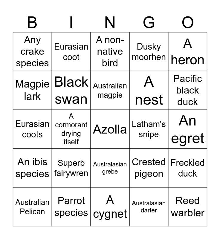 This bingo card has a free space and 29 words: Australian Pelican, A swimming cormorant, A cormorant drying itself, Royal spoonbill, Any crake species, A non-native bird, Black swan, Superb fairywren, Latham's snipe, Parrot species, An egret, Reed warbler, A cygnet, Australasian darter, Pacific black duck, Australasian shoveler, Australasian grebe, An ibis species, A heron, Eurasian coots, Crested pigeon, A raptor, A nest, Magpie lark, Dusky moorhen, Eurasian coot, Freckled duck, Australian magpie and Pied currawong.