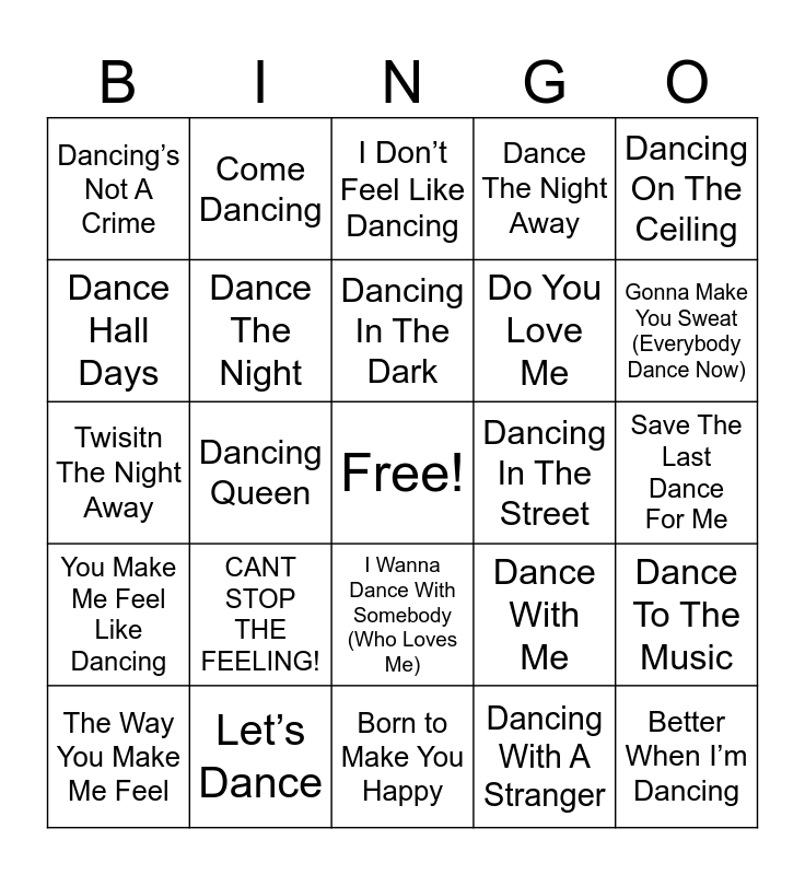 This bingo card has a free space and 50 words: All She Wants To Do Is Dance, Better When I’m Dancing, Boogie Shoes, Born to Make You Happy, CANT STOP THE FEELING!, Cha Cha Slide, Come Dancing, Cupid Shuffle, Dance Hall Days, Dance Monkey, Dance The Night, Dance The Night Away, Dance To The Music, Dance With Me, Dance With Somebody, Dance, Dance, Dancing In The Dark, Dancing In The Street, Dancing On My Own, Dancing On The Ceiling, Dancing Queen, Dancing With A Stranger, Dancing’s Not A Crime, Do You Love Me, Don’t Stop The Music, Footloose, Gonna Make You Sweat (Everybody Dance Now), I Can’t Dance, I Don’t Feel Like Dancing, I Wanna Dance With Somebody (Who Loves Me), Into The Groove, Just Dance, Last Dance, Let It Whip, Let’s Dance, Let’s Go Dancing, Let’s Groove, Magic Dance, Rhythm Is A Dancer, Save The Last Dance For Me, Shake It Off, Shut Up and Dance, Stayin Alive, The Anthem, The Way You Make Me Feel, Twisitn The Night Away, Twist and Shout, What’s Love Got To Do With It, You Make Me Feel Like Dancing and You Should Be Dancing.