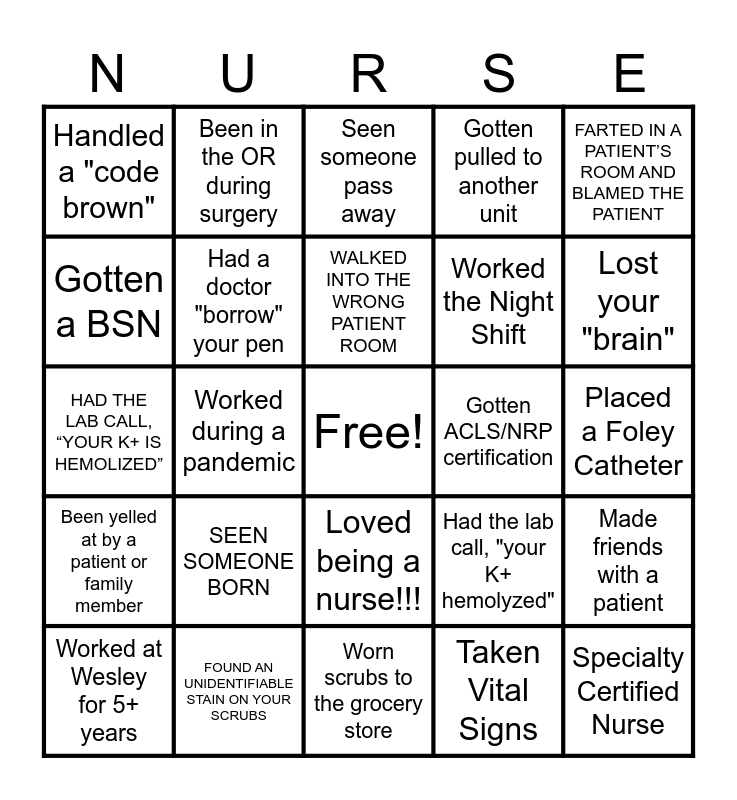 This bingo card has a free space and 24 words: Worked at Wesley for 5+ years, SEEN SOMEONE BORN, WALKED INTO THE WRONG PATIENT ROOM, Taken Vital Signs, FARTED IN A PATIENT’S ROOM AND BLAMED THE PATIENT, Handled a "code brown", Been in the OR during surgery, Seen someone pass away, Gotten ACLS/NRP certification, Placed a Foley Catheter, HAD THE LAB CALL, “YOUR K+ IS HEMOLIZED”, Had a doctor "borrow" your pen, Had the lab call, "your K+ hemolyzed", Made friends with a patient, Gotten a BSN, FOUND AN UNIDENTIFIABLE STAIN ON YOUR SCRUBS, Worn scrubs to the grocery store, Gotten pulled to another unit, Lost your "brain", Been yelled at by a patient or family member, Worked during a pandemic, Loved being a nurse!!!, Worked the Night Shift and Specialty Certified Nurse.