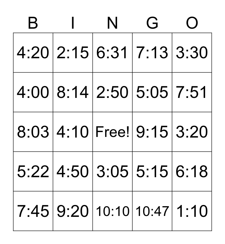 This bingo card has a free space and 68 words: 1:00, 1:10, 1:15, 1:30, 1:45, 2:00, 2:15, 2:35, 2:50, 3:00, 3:05, 3:15, 3:20, 3:30, 3:45, 4:00, 4:10, 4:20, 4:40, 4:50, 5:05, 5:15, 5:22, 5:33, 5:44, 5:55, 6:00, 6:12, 6:18, 6:21, 6:31, 6:41, 6:51, 7:08, 7:13, 7:24, 7:36, 7:45, 7:51, 8:03, 8:10, 8:11, 8:14, 8:30, 8:39, 8:48, 8:57, 9:00, 9:15, 9:20, 9:30, 9:40, 10:00, 10:10, 10:14, 10:29, 10:47, 10:59, 11:00, 11:15, 11:30, 11:45, 12:00, 12:09, 12:20, 12:30, 12:45 and 12:55.