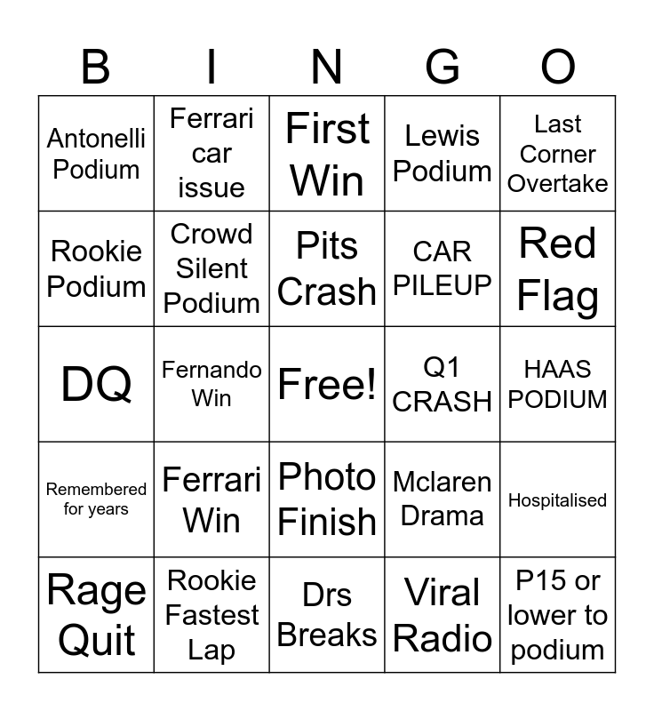 This bingo card has a free space and 24 words: Ferrari Win, Rookie Fastest Lap, Pits Crash, Rage Quit, Last Corner Overtake, Antonelli Podium, Rookie Podium, Ferrari car issue, Q1 CRASH, Photo Finish, CAR PILEUP, DQ, Mclaren Drama, Hospitalised, Crowd Silent Podium, Viral Radio, HAAS PODIUM, First Win, Red Flag, Fernando Win, P15 or lower to podium, Remembered for years, Lewis Podium and Drs Breaks.
