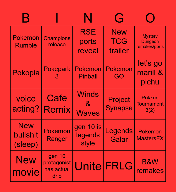 This bingo card has a free space and 24 words: Pokemon Ranger, gen 10 protagonist has actual drip, Pokemon Pinball, New movie, Mystery Dungeon remakes/ports, Pokemon Rumble, Pokopia, Champions release, Project Synapse, gen 10 is legends style, Pokemon GO, voice acting?, Legends Galar, Pokemon MastersEX, Pokepark 3, FRLG, Pokken Tournament 3(2), RSE ports reveal, let's go marill & pichu, Cafe Remix, B&W remakes, New bullshit (sleep), New TCG trailer and Unite.