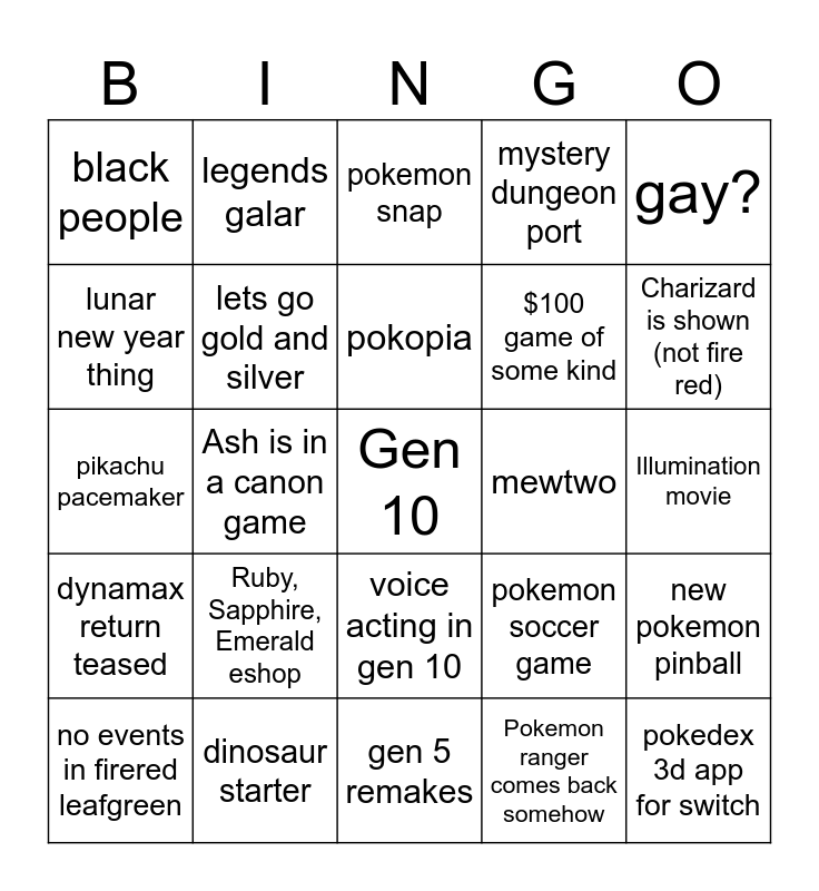 This bingo card has a free space and 24 words: Ruby, Sapphire, Emerald eshop, dinosaur starter, pokopia, no events in firered leafgreen, gay?, black people, lunar new year thing, legends galar, mewtwo, voice acting in gen 10, $100 game of some kind, pikachu pacemaker, pokemon soccer game, new pokemon pinball, lets go gold and silver, Pokemon ranger comes back somehow, Illumination movie, pokemon snap, Charizard is shown (not fire red), Ash is in a canon game, pokedex 3d app for switch, dynamax return teased, mystery dungeon port and gen 5 remakes.