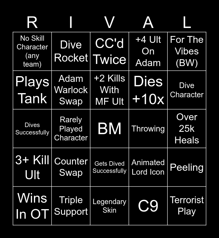 This bingo card has 25 words: 3+ Kill Ult, Triple Support, BM, C9, For The Vibes (BW), No Skill Character (any team), Dive Rocket, CC'd Twice, Throwing, Peeling, Plays Tank, Adam Warlock Swap, Legendary Skin, Animated Lord Icon, Dive Character, Wins In OT, Rarely Played Character, +2 Kills With MF Ult, Dies +10x, Over 25k Heals, Dives Successfully, Counter Swap, Gets Dived Successfully, +4 Ult On Adam and Terrorist Play.