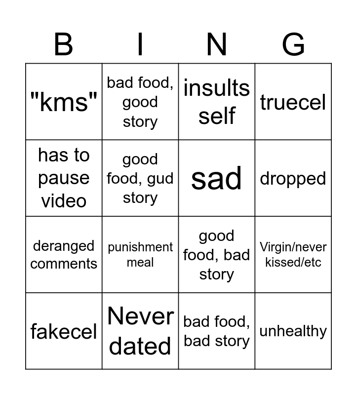 This bingo card has 16 words: Never dated, Virgin/never kissed/etc, insults self, "kms", deranged comments, bad food, good story, good food, bad story, bad food, bad story, has to pause video, good food, gud story, fakecel, truecel, punishment meal, dropped, sad and unhealthy.