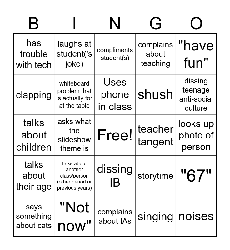 This bingo card has a free space and 24 words: talks about another class/person (other period or previous years), "Not now", Uses phone in class, says something about cats, "have fun", has trouble with tech, clapping, laughs at student('s joke), teacher tangent, dissing IB, shush, talks about children, storytime, "67", whiteboard problem that is actually for at the table, singing, looks up photo of person, compliments student(s), dissing teenage anti-social culture, asks what the slideshow theme is, noises, talks about their age, complains about teaching and complains about IAs.