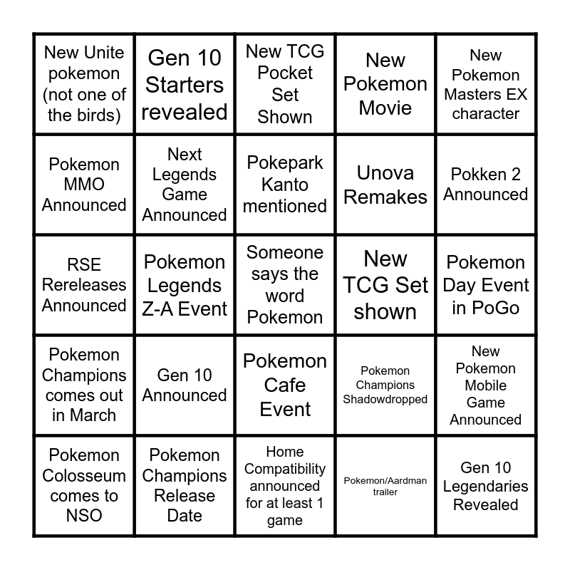This bingo card has a free space and 24 words: Gen 10 Announced, Pokemon Champions Release Date, Pokepark Kanto mentioned, Pokemon Colosseum comes to NSO, New Pokemon Masters EX character, New Unite pokemon (not one of the birds), Pokemon MMO Announced, Gen 10 Starters revealed, New TCG Set shown, Pokemon Cafe Event, Unova Remakes, RSE Rereleases Announced, Pokemon Champions Shadowdropped, New Pokemon Mobile Game Announced, Next Legends Game Announced, Pokemon/Aardman trailer, Pokemon Day Event in PoGo, New TCG Pocket Set Shown, Pokken 2 Announced, Pokemon Legends Z-A Event, Gen 10 Legendaries Revealed, Pokemon Champions comes out in March, New Pokemon Movie and Home Compatibility announced for at least 1 game.