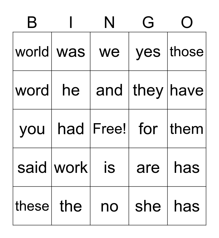 This bingo card has a free space and 24 words: work, the, and, these, those, world, word, was, for, is, they, you, are, has, he, she, them, we, have, had, has, said, yes and no.