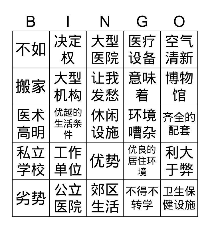 This bingo card has 25 words: 工作单位, 郊区生活, 让我发愁, 劣势, 空气清新, 不如, 搬家, 决定权, 环境嘈杂, 优势, 意味着, 医术高明, 优良的居住环境, 利大于弊, 大型机构, 卫生保健设施, 齐全的配套, 大型医院, 博物馆, 优越的生活条件, 休闲设施, 公立医院, 私立学校, 医疗设备 and 不得不转学.