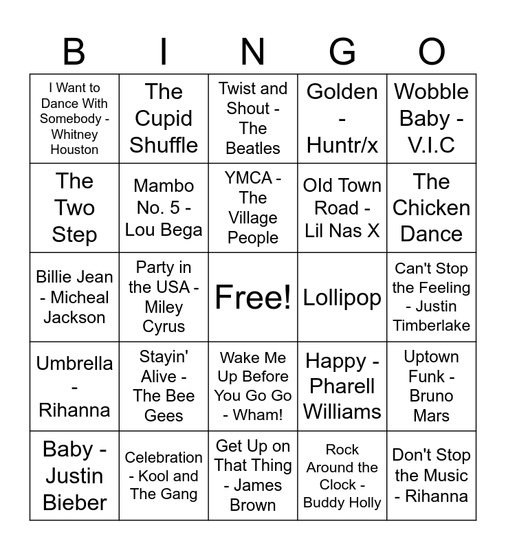 This bingo card has a free space and 24 words: Stayin' Alive - The Bee Gees, Celebration - Kool and The Gang, YMCA - The Village People, Baby - Justin Bieber, Wobble Baby - V.I.C, I Want to Dance With Somebody - Whitney Houston, The Two Step, The Cupid Shuffle, Lollipop, Wake Me Up Before You Go Go - Wham!, OId Town Road - Lil Nas X, Billie Jean - Micheal Jackson, Happy - Pharell Williams, Uptown Funk - Bruno Mars, Mambo No. 5 - Lou Bega, Rock Around the Clock - Buddy Holly, Can't Stop the Feeling - Justin Timberlake, Twist and Shout -The Beatles, The Chicken Dance, Party in the USA - Miley Cyrus, Don't Stop the Music - Rihanna, Umbrella - Rihanna, Golden - Huntr/x and Get Up on That Thing - James Brown.