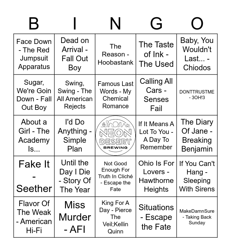 This bingo card has a free space and 50 words: Dear Maria, Count Me In - All Time Low, MakeDamnSure - Taking Back Sunday, What's My Age Again? - blink-182, King For A Day - Pierce The Veil;Kellin Quinn, Until the Day I Die - Story Of The Year, I Don't Wanna Be In Love - Good Charlotte, Dead on Arrival - Fall Out Boy, Miserable At Best - Mayday Parade, Sugar, We're Goin Down - Fall Out Boy, Misery Business - Paramore, Swing, Swing - The All American Rejects, The Taste of Ink - The Used, If You Can't Hang - Sleeping With Sirens, Ohio Is For Lovers - Hawthorne Heights, Jesus Christ - Brand New, Ocean Avenue - Yellowcard, Famous Last Words - My Chemical Romance, If It Means A Lot To You - A Day To Remember, Smile In Your Sleep - Silverstein, Baby, You Wouldn't Last... - Chiodos, I'd Do Anything - Simple Plan, Situations - Escape the Fate, Face Down - The Red Jumpsuit Apparatus, Calling All Cars - Senses Fail, The Kill - Thirty Seconds To Mars, 1985 - Bowling For Soup, DONTTRUSTME - 3OH!3, Vindicated - Dashboard Confessional, The Reason - Hoobastank, Not Good Enough For Truth In Cliché - Escape the Fate, Sk8er Boi - Avril Lavigne, Note to Self - From First To Last, Fat Lip - Sum 41, The Curse of Curves - Cute Is What We Aim For, Miss Murder - AFI, Scars - Papa Roach, Everything Is Alright - Motion City Soundtrack, Trouble - Never Shout Never, Brain Stew - Green Day, The Diary Of Jane - Breaking Benjamin, All over You - The Spill Canvas, Seven Years - Saosin, Memory - Sugarcult, All Around Me - Flyleaf, Flavor Of The Weak - American Hi-Fi, About a Girl - The Academy Is..., Stacy's Mom - Fountains Of Wayne, Beverly Hills - Weezer, Fake It - Seether and Your Call - Secondhand Serenade.