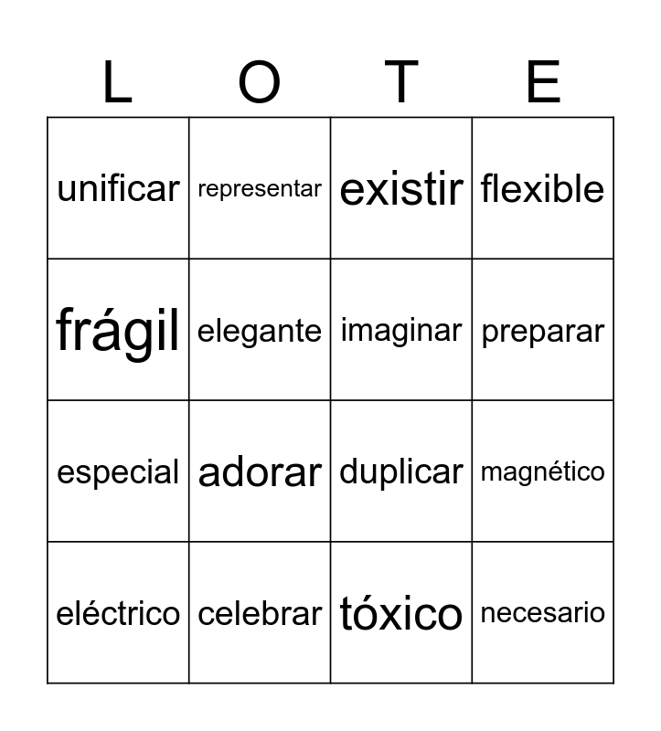 This bingo card has 28 words: adicional, condicional, especial, tradicional, elegante, existir, representar, necesario, celebrar, comunicar, duplicar, flexible, posible, conflicto, adorar, combinar, decidir, imaginar, preparar, notificar, unificar, paciencia, eléctrico, magnético, tóxico, líquido, frágil and atención.