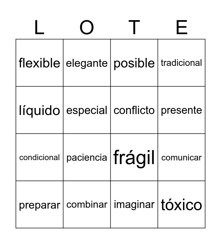 This bingo card has 29 words: necesario, celebrar, comunicar, duplicar, flexible, posible, conflicto, adorar, combinar, decidir, imaginar, preparar, notificar, unificar, paciencia, eléctrico, magnético, tóxico, líquido, frágil, atención, adicional, condicional, especial, tradicional, elegante, existir, presente and representar.