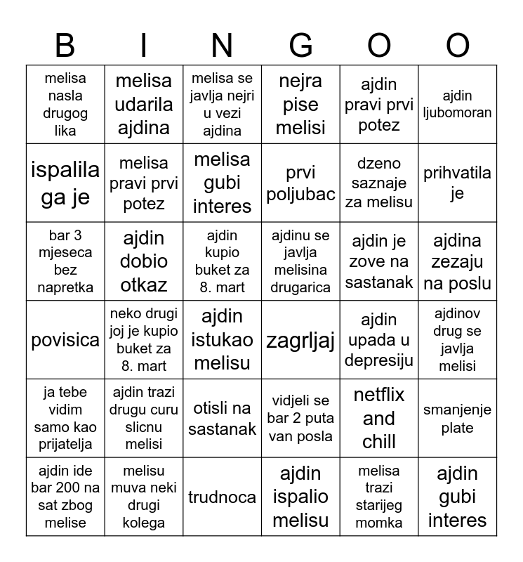 This bingo card has 36 words: vidjeli se bar 2 puta van posla, otisli na sastanak, ajdin ispalio melisu, ispalila ga je, povisica, ajdinu se javlja melisina drugarica, melisa pravi prvi potez, trudnoca, ajdin pravi prvi potez, netflix and chill, prihvatila je, nejra pise melisi, smanjenje plate, ajdin dobio otkaz, prvi poljubac, melisa nasla drugog lika, ja tebe vidim samo kao prijatelja, ajdin je zove na sastanak, bar 3 mjeseca bez napretka, melisa se javlja nejri u vezi ajdina, ajdin kupio buket za 8. mart, neko drugi joj je kupio buket za 8. mart, zagrljaj, ajdin istukao melisu, ajdin upada u depresiju, melisa udarila ajdina, dzeno saznaje za melisu, melisu muva neki drugi kolega, melisa gubi interes, ajdin ljubomoran, ajdin gubi interes, ajdin ide bar 200 na sat zbog melise, ajdinov drug se javlja melisi, ajdina zezaju na poslu, ajdin trazi drugu curu slicnu melisi and melisa trazi starijeg momka.