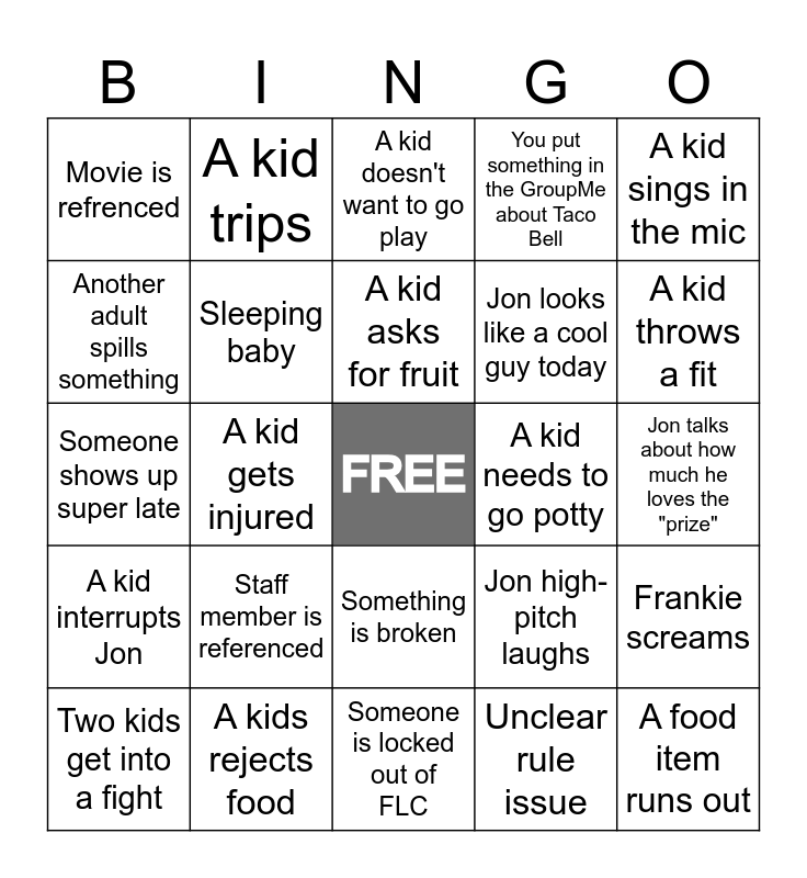 This bingo card has a free space and 29 words: A kid spills their drink, A kids rejects food, A kid doesn't want to go play, Jon says something about Survivor, A kid sings in the mic, Movie is refrenced, Sleeping baby, A kid asks for fruit, A kid needs to go potty, Frankie screams, Two kids get into a fight, A kid gets injured, Unclear rule issue, A food item runs out, Someone shows up super late, Jon screws something up, Someone is locked out of FLC, Jon high-pitch laughs, A kid throws a fit, A kid interrupts Jon, Staff member is referenced, upset baby, Jon looks like a cool guy today, Jon talks about how much he loves the "prize", Another adult spills something, A kid trips, Something is broken, You put something in the GroupMe about Taco Bell and A kid does something sweet to another kid.