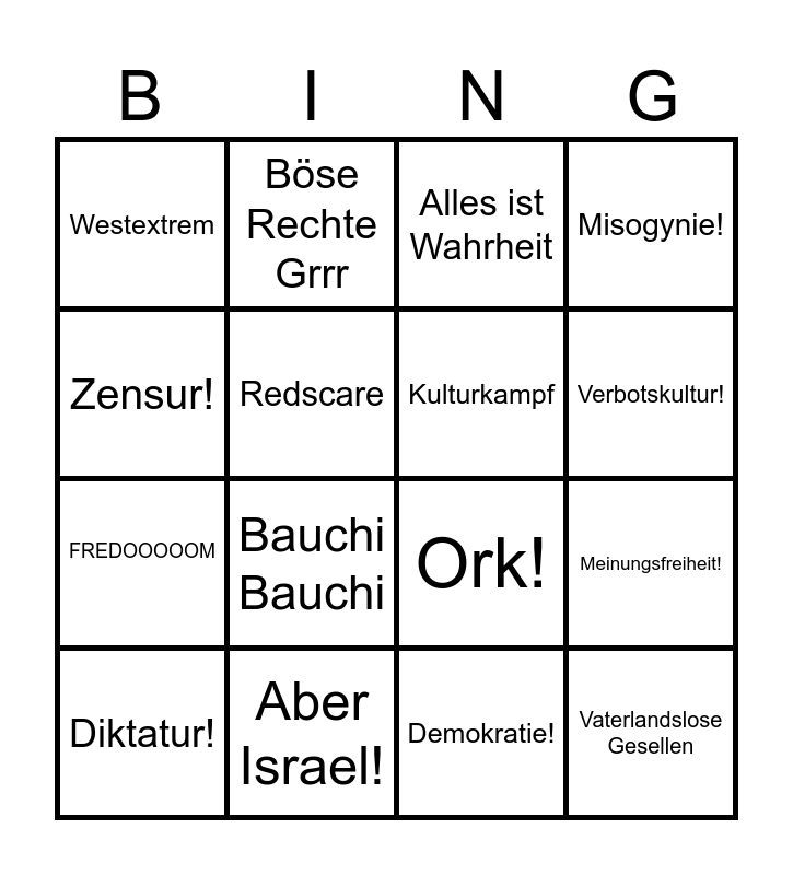 This bingo card has 16 words: Aber Israel!, Meinungsfreiheit!, Alles ist Wahrheit, Westextrem, FREDOOOOOM, Böse Rechte Grrr, Ork!, Demokratie!, Zensur!, Redscare, Diktatur!, Misogynie!, Bauchi Bauchi, Verbotskultur!, Kulturkampf and Vaterlandslose Gesellen.