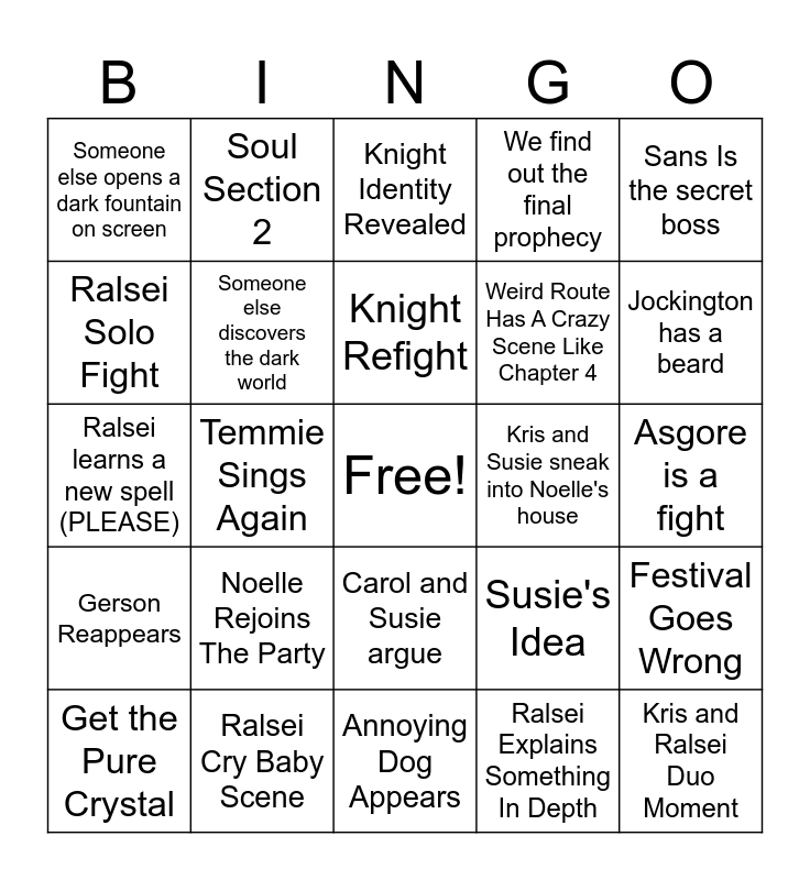 This bingo card has a free space and 24 words: Noelle Rejoins The Party, Ralsei Cry Baby Scene, Knight Refight, Get the Pure Crystal, Sans Is the secret boss, Someone else opens a dark fountain on screen, Ralsei Solo Fight, Soul Section 2, Kris and Susie sneak into Noelle's house, Carol and Susie argue, Weird Route Has A Crazy Scene Like Chapter 4, Ralsei learns a new spell (PLEASE), Susie's Idea, Festival Goes Wrong, Someone else discovers the dark world, Ralsei Explains Something In Depth, Asgore is a fight, Knight Identity Revealed, Jockington has a beard, Temmie Sings Again, Kris and Ralsei Duo Moment, Gerson Reappears, We find out the final prophecy and Annoying Dog Appears.