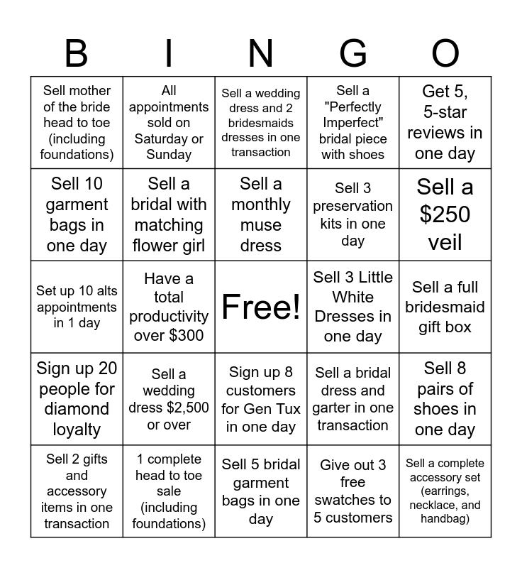 This bingo card has a free space and 24 words: Sell a wedding dress $2,500 or over, 1 complete head to toe sale (including foundations), Sell a monthly muse dress, Sell 2 gifts and accessory items in one transaction, Get 5, 5-star reviews in one day, Sell mother of the bride head to toe (including foundations), Sell 10 garment bags in one day, All appointments sold on Saturday or Sunday, Sell 3 Little White Dresses in one day, Sign up 8 customers for Gen Tux in one day, Sell 3 preservation kits in one day, Set up 10 alts appointments in 1 day, Sell a bridal dress and garter in one transaction, Sell 8 pairs of shoes in one day, Sell a bridal with matching flower girl, Give out 3 free swatches to 5 customers, Sell a full bridesmaid gift box, Sell a wedding dress and 2 bridesmaids dresses in one transaction, Sell a $250 veil, Have a total productivity over $300, Sell a complete accessory set (earrings, necklace, and handbag), Sign up 20 people for diamond loyalty, Sell a "Perfectly Imperfect" bridal piece with shoes and Sell 5 bridal garment bags in one day.
