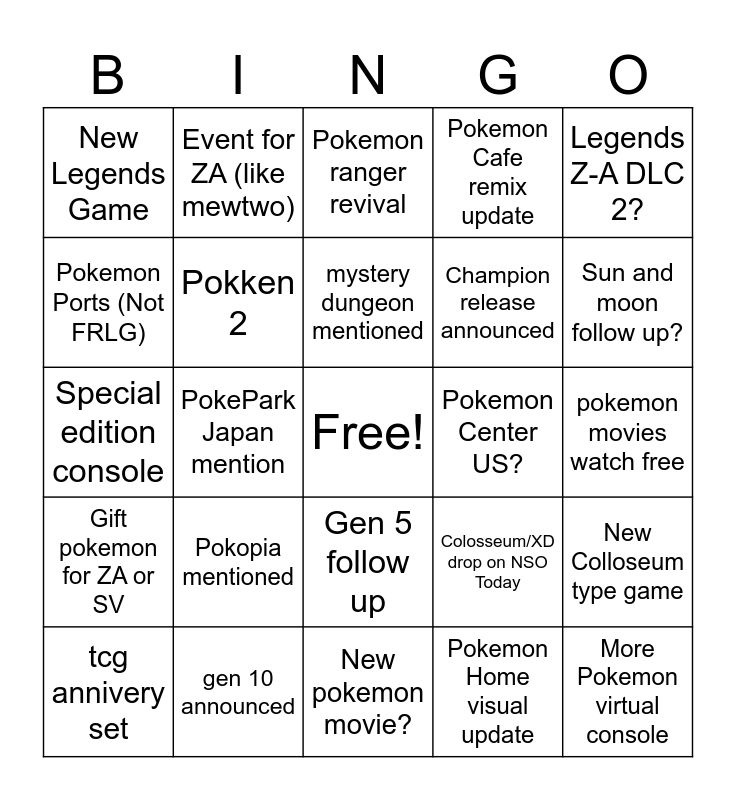 This bingo card has a free space and 24 words: Pokopia mentioned, gen 10 announced, mystery dungeon mentioned, tcg annivery set, Legends Z-A DLC 2?, New Legends Game, Pokemon Ports (Not FRLG), Event for ZA (like mewtwo), Pokemon Center US?, Gen 5 follow up, Champion release announced, Special edition console, Colosseum/XD drop on NSO Today, New Colloseum type game, Pokken 2, Pokemon Home visual update, pokemon movies watch free, Pokemon ranger revival, Sun and moon follow up?, PokePark Japan mention, More Pokemon virtual console, Gift pokemon for ZA or SV, Pokemon Cafe remix update and New pokemon movie?.