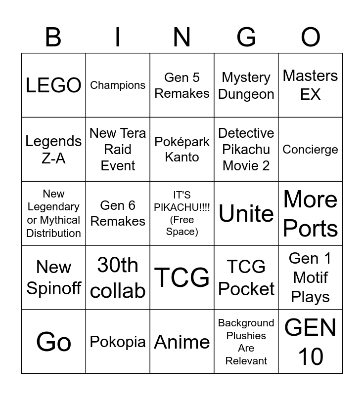This bingo card has a free space and 24 words: 30th collab, Pokopia, Poképark Kanto, Go, Masters EX, LEGO, Legends Z-A, Champions, Unite, TCG, Detective Pikachu Movie 2, New Legendary or Mythical Distribution, TCG Pocket, Gen 1 Motif Plays, New Tera Raid Event, Background Plushies Are Relevant, More Ports, Gen 5 Remakes, Concierge, Gen 6 Remakes, GEN 10, New Spinoff, Mystery Dungeon and Anime.