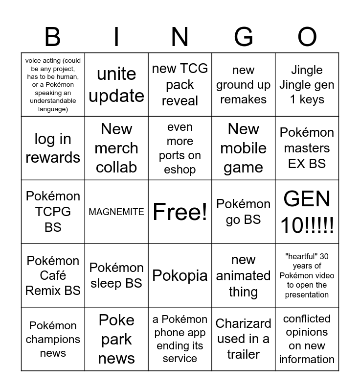 This bingo card has a free space and 24 words: Pokémon sleep BS, Poke park news, even more ports on eshop, Pokémon champions news, Jingle Jingle gen 1 keys, voice acting (could be any project, has to be human, or a Pokémon speaking an understandable language), log in rewards, unite update, Pokémon go BS, Pokopia, New mobile game, Pokémon TCPG BS, new animated thing, "heartful" 30 years of Pokémon video to open the presentation, New merch collab, Charizard used in a trailer, GEN 10!!!!!, new TCG pack reveal, Pokémon masters EX BS, MAGNEMITE, conflicted opinions on new information, Pokémon Café Remix BS, new ground up remakes and a Pokémon phone app ending its service.