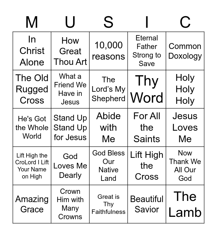 This bingo card has 44 words: A Mighty Fortress, Abide with Me, All Glory Laud and Honor, Amazing Grace, America (My Country Tis of Thee), Beautiful Savior, 10,000 reasons, Children of the Heavenly Father, Common Doxology, Crown Him with Many Crowns, Eternal Father Strong to Save, For All the Saints, God Bless Our Native Land, God Loves Me Dearly, Good Good Father, Great is Thy Faithfulness, Hark the Voice of Jesus Crying, He's Got the Whole World, Here I Am to Worship, Holy Holy Holy, How Great Thou Art, I am Jesus’ Little Lamb, I Know that My Redeemer Lives, In Christ Alone, It is Well with My Soul, Jesus Loves Me, Joyful Joyful We Adore Thee, Just as I Am, Lift High the Cross, Lift High the CroLord I Lift Your Name on High, My Hope is Built on Nothing Less, Now Thank We All Our God, Onward Christian Soldiers, Rock of Ages, Stand Up Stand Up for Jesus, Take My Life and Let it Be, The Church’s One Foundation, The Lamb, The Lord’s My Shepherd, The Old Rugged Cross, Thy Word, Were You There, What a Friend We Have in Jesus and When I Survey the Wondrous Cross.