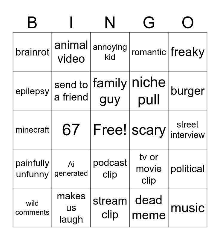 This bingo card has a free space and 24 words: Ai generated, makes us laugh, family guy, wild comments, freaky, brainrot, epilepsy, animal video, scary, podcast clip, niche pull, minecraft, tv or movie clip, political, send to a friend, dead meme, street interview, annoying kid, burger, 67, music, painfully unfunny, romantic and stream clip.