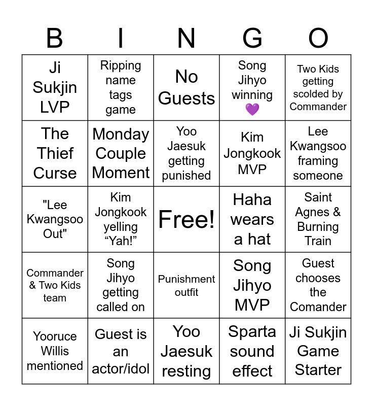 This bingo card has a free space and 24 words: Song Jihyo getting called on, Guest is an actor/idol, Yoo Jaesuk getting punished, Yooruce Willis mentioned, Two Kids getting scolded by Commander, Ji Sukjin LVP, The Thief Curse, Ripping name tags game, Haha wears a hat, Punishment outfit, Kim Jongkook MVP, "Lee Kwangsoo Out", Song Jihyo MVP, Guest chooses the Comander, Monday Couple Moment, Sparta sound effect, Saint Agnes & Burning Train, No Guests, Lee Kwangsoo framing someone, Kim Jongkook yelling “Yah!”, Ji Sukjin Game Starter, Commander & Two Kids team, Song Jihyo winning 💜 and Yoo Jaesuk resting.