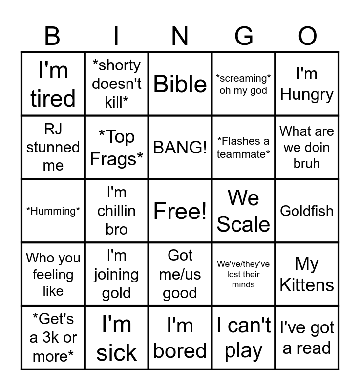 This bingo card has a free space and 24 words: I'm joining gold, I'm sick, BANG!, *Get's a 3k or more*, I'm Hungry, I'm tired, RJ stunned me, *shorty doesn't kill*, We Scale, Got me/us good, *Flashes a teammate*, *Humming*, We've/they've lost their minds, My Kittens, *Top Frags*, I can't play, Goldfish, Bible, What are we doin bruh, I'm chillin bro, I've got a read, Who you feeling like, *screaming* oh my god and I'm bored.