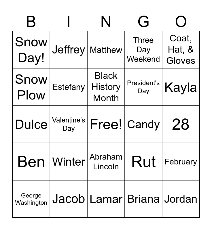 This bingo card has a free space and 24 words: Winter, Jacob, Black History Month, George Washington, Coat, Hat, & Gloves, Snow Day!, Snow Plow, Jeffrey, Candy, Abraham Lincoln, President's Day, Dulce, Rut, February, Estefany, Briana, 28, Matthew, Kayla, Valentine's Day, Jordan, Ben, Three Day Weekend and Lamar.