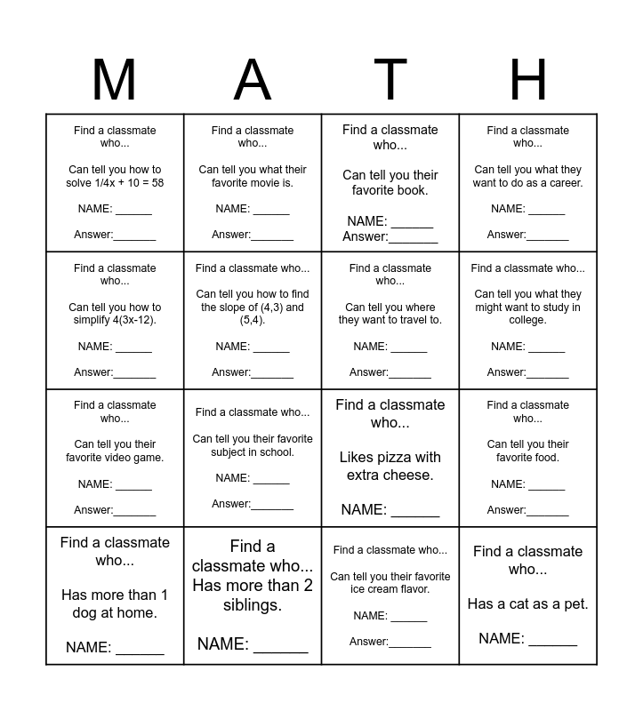 This bingo card has 16 words: Find a classmate who... Has more than 2 siblings. NAME: ______, Find a classmate who... Can tell you their favorite food. NAME: ______ Answer:_______, Find a classmate who... Can tell you their favorite book. NAME: ______ Answer:_______, Find a classmate who... Can tell you how to solve 1/4x + 10 = 58 NAME: ______ Answer:_______, Find a classmate who... Can tell you their favorite video game. NAME: ______ Answer:_______, Find a classmate who... Can tell you what their favorite movie is. NAME: ______ Answer:_______, Find a classmate who... Likes pizza with extra cheese. NAME: ______, Find a classmate who... Can tell you their favorite ice cream flavor. NAME: ______ Answer:_______, Find a classmate who... Can tell you how to simplify 4(3x-12). NAME: ______ Answer:_______, Find a classmate who... Can tell you how to find the slope of (4,3) and (5,4). NAME: ______ Answer:_______, Find a classmate who... Has more than 1 dog at home. NAME: ______, Find a classmate who... Can tell you what they want to do as a career. NAME: ______ Answer:_______, Find a classmate who... Can tell you their favorite subject in school. NAME: ______ Answer:_______, Find a classmate who... Can tell you what they might want to study in college. NAME: ______ Answer:_______, Find a classmate who... Can tell you where they want to travel to. NAME: ______ Answer:_______ and Find a classmate who... Has a cat as a pet. NAME: ______.