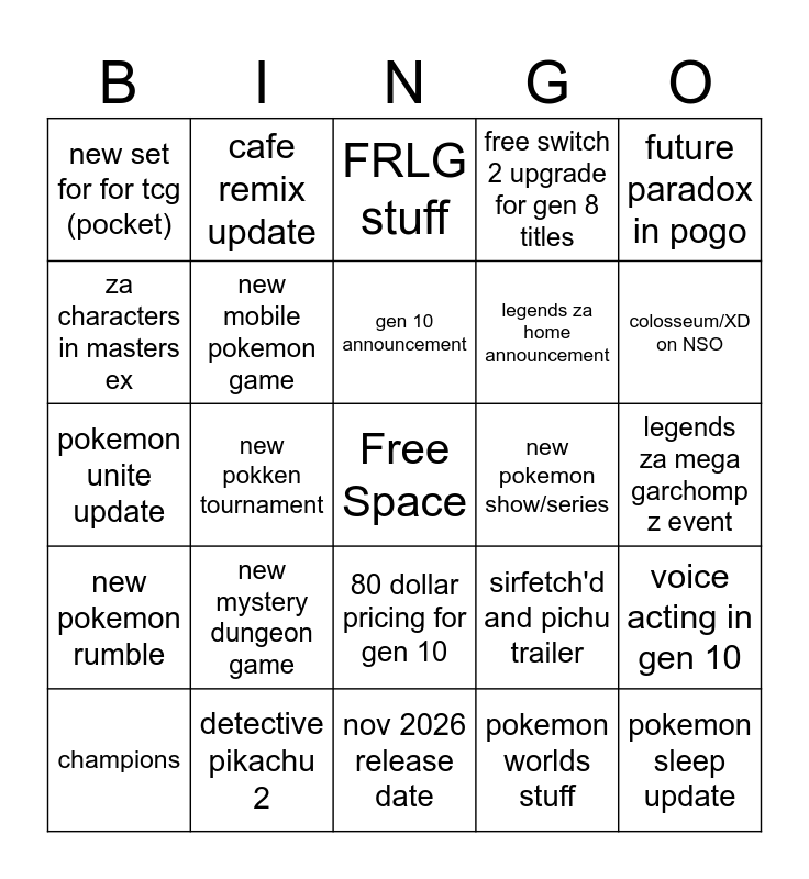 This bingo card has a free space and 24 words: new mystery dungeon game, detective pikachu 2, gen 10 announcement, champions, future paradox in pogo, new set for for tcg (pocket), za characters in masters ex, cafe remix update, new pokemon show/series, 80 dollar pricing for gen 10, legends za home announcement, pokemon unite update, sirfetch'd and pichu trailer, voice acting in gen 10, new mobile pokemon game, pokemon worlds stuff, legends za mega garchomp z event, FRLG stuff, colosseum/XD on NSO, new pokken tournament, pokemon sleep update, new pokemon rumble, free switch 2 upgrade for gen 8 titles and nov 2026 release date.