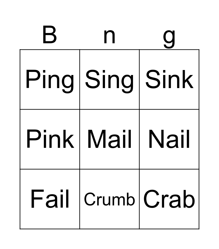 This bingo card has 12 words: King, Crab, Mail, Nail, Sing, Sink, Crumb, Crop, Ping, Pink, Fail and Rain.