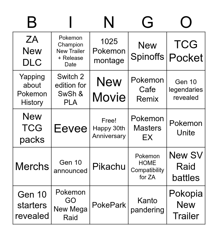This bingo card has a free space and 24 words: Gen 10 announced, Pokemon GO New Mega Raid, New Movie, Gen 10 starters revealed, TCG Pocket, ZA New DLC, Yapping about Pokemon History, Pokemon Champion New Trailer + Release Date, Pokemon Masters EX, Pikachu, Pokemon Cafe Remix, New TCG packs, Pokemon HOME Compatibility for ZA, New SV Raid battles, Switch 2 edition for SwSh & PLA, Kanto pandering, Pokemon Unite, 1025 Pokemon montage, Gen 10 legendaries revealed, Eevee, Pokopia New Trailer, Merchs, New Spinoffs and PokePark.